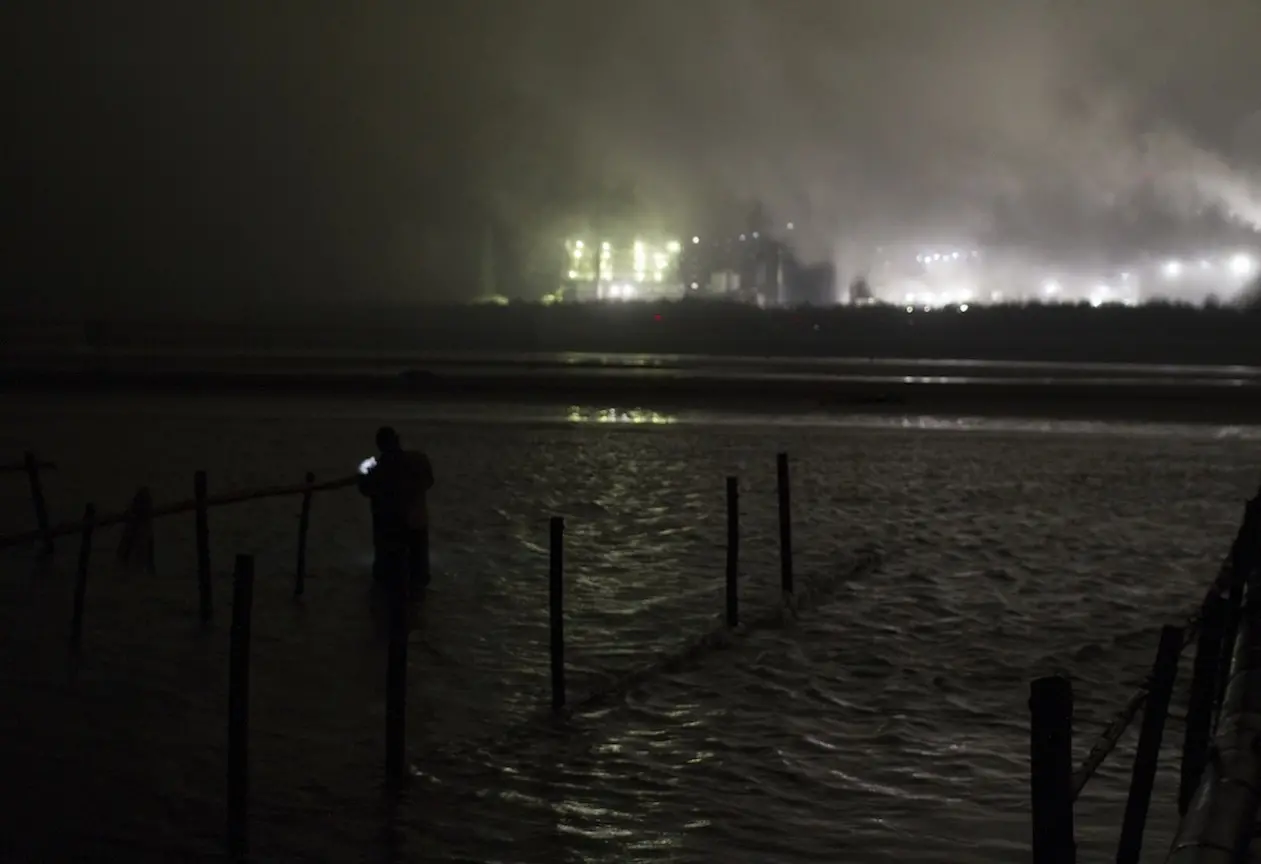 圖:蚵農凌晨時摸黑在六輕的惡臭空氣下工作(陳柏銓,2012年攝,CC BY 3.0 授權)來源網址: https://cyberisland.teldap.tw/P/qHUFtxLuwSQ。